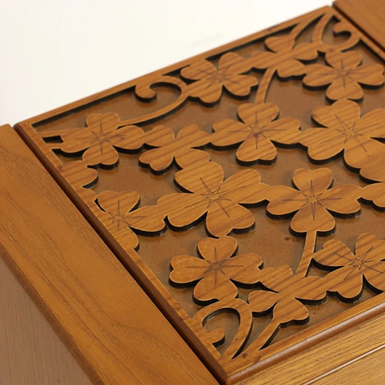 Offrez à vos bijoux un abri raffiné et pratique avec notre boîte à bijoux en bois spacieuse. Conçu en bois massif, ce coffret séduit par son charme intemporel et sa capacité de rangement exceptionnelle. Son design clair et chaleureux, sublimé par des motifs floraux sculptés, en fait un véritable objet décoratif à part entière.
