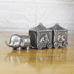 Jolie petit rangement pour petits bijoux ou accessoires de petites tailles. Faites plaisir à un enfant avec ce petit train conduit par un éléphant. Objet fabriqué en zinc, compartiments recouverts de velours bleu. Objet original décoratif.