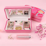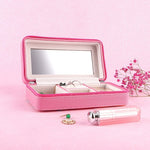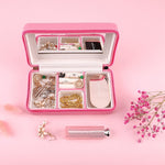 Boîte à bijoux en similicuir rose avec motifs géométrique. Munie d'un petit miroir et des compartiments classiques, vous pouvez vous balader facilement avec un belle quantité de vos précieux trésors.