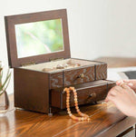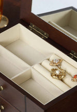 - Rangements : 3 tiroirs, 1 compartiment principal, compartiments pour bagues, boucles d'oreilles, colliers et sautoirs