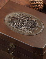 Avec ses trois tiroirs et son compartiment principal, elle dispose de tous les espaces nécessaires pour organiser vos bagues, boucles d'oreilles, colliers et sautoirs. Le couvercle est muni d'un miroir et une serrure sécurise l'ensemble. Son design classique et intemporel est sublimé par une gravure en forme de pomme de pin, et l'intérieur en velours crème contraste élégamment avec le bois. Cette boîte d'exception est une édition limitée, l'occasion de vous offrir un écrin noble pour vos trésors les plus précieux. Profitez de la livraison standard offerte 🚚.