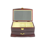 - Caractéristiques : Bois massif, miroir recouvrant toute la surface, fermoir doré contrastant, intérieur entièrement recouvert de velours doux