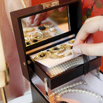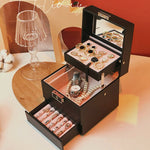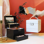 Avec son ouverture semi-automatique, elle révèle trois couches de rangement pour organiser tous vos accessoires. L'intérieur est tapissé de velours et équipé de boudins rembourrés pour vos bagues et boucles d'oreilles. Des espaces plus larges et ajustables peuvent accueillir des bracelets rigides ou des bijoux en bois. Un miroir, un tiroir et une serrure complètent cet ensemble, en faisant un cadeau idéal et un écrin sûr pour vos trésors. Profitez de la livraison standard offerte 🚚.