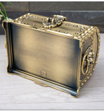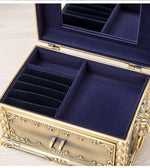Mettez à l'abri toute votre collection de bijoux dans cette jolie boîte en or. Fabriquée en métal elle est composée d'un large espace principal pour ranger facilement les bagues, les boucles d'oreilles et les bracelets. Un tiroir offre un espace supplémentaire pour stocker des accessoires plus volumineux. Rangement vintage disponible en or ou en bronze. Intérieur recouvert d'un velours bleu roi. Serrure avec cadenas. et miroir intégré sous le couvercle.