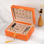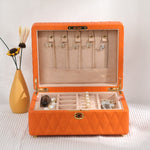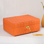 Notre somptueuse boîte en cuir pour femme sera le gardien de la flamboyance de vos trésors. Disponible dans deux sublimes coloris (orange, rose), e coffret est monté sur quatre pieds qui réhaussent élégamment la structure pour lui donner du prestige.