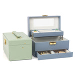 Magnifique coffret à bijoux travaillé en cuir brillant. Disponible en deux versions bleu ou verte cette boîte offre un style unique avec le contraste doré de la serrure.