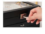 Cette boîte dispose également de deux tiroirs de rangement munis de séparateurs. Ces derniers sont essentiels pour empêcher que vos bijoux ne s'entrechoquent et ne s'abîment, assurant ainsi leur longévité. Le compartiment supérieur est sécurisé et une serrure complète ce coffret, offrant une tranquillité d'esprit supplémentaire pour vos trésors les plus précieux.