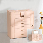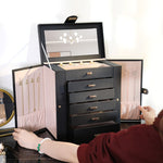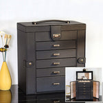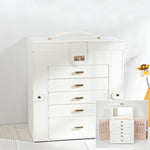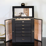 Avec ses 7 couches de rangement, elle offre une capacité impressionnante : jusqu’à 30 compartiments pour vos bagues, boucles d’oreilles et bracelets, ainsi que des tiroirs adaptés aux pièces plus volumineuses comme les montres. Sur les côtés, deux portes latérales révèlent des crochets pratiques pour suspendre colliers et sautoirs en toute sécurité.