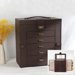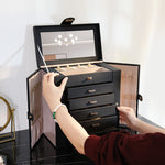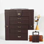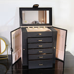 Chaque détail est pensé pour une organisation claire et agréable. La partie supérieure est idéale pour les bijoux délicats, tandis que les compartiments inférieurs accueillent vos trésors plus imposants. Une poignée en cuir vient parfaire l’ensemble, rendant ce coffret à la fois pratique et transportable.