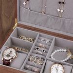 - Rangements : Crochets pour colliers et pendentifs, compartiments pour montres, boudins rembourrés pour bagues et boucles d’oreilles