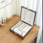 Colliers ou bagues sont à l'abris dans cette boîte réalisée en bois mdf. Sa finition en placage de noyer lui donne cet aspect design avec son fermoir doré et son velours blanc qui contraste.