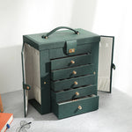 Travaillée en similicuir notre grande boîte verte dévoile plusieurs compartiments ingénieux permettant le rangement de vos trésors. Des portes équipée de supports pour colliers, cinq tiroirs pour disposer les gros accessoires et enfin un compartiment principal sur lequel vous pouvez trier bagues, anneaux et boucles d'oreilles.