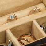 • Rangements : Espaces vides, emplacements pour bagues, compartiments espacés pour éviter que les bijoux s'accrochent, pour bagues, boucles d'oreilles et bracelets